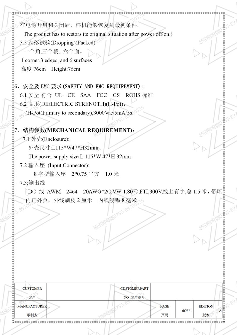 19V3.5A電源適配器規格書